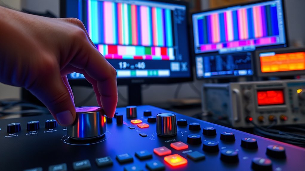 Choosing the right video test pattern is key to effectively calibrating your audio-visual setup. To address lip sync issues accurately, select a test pattern that clearly displays synchronized audio and video cues. Look for patterns with moving elements, like a bouncing ball or a person speaking, which make timing discrepancies obvious. The goal is to choose a test pattern that highlights lip movements and audio cues simultaneously, making it easier to identify sync problems. Effective test pattern selection helps you pinpoint delays and fine-tune your settings precisely. Avoid patterns that are too static or lack visual cues, as they won’t help you detect lip sync issues. Keep your choice simple, clear, and designed for synchronization testing to ensure accurate calibration. Additionally, understanding audio delay can help you make more precise adjustments during calibration.