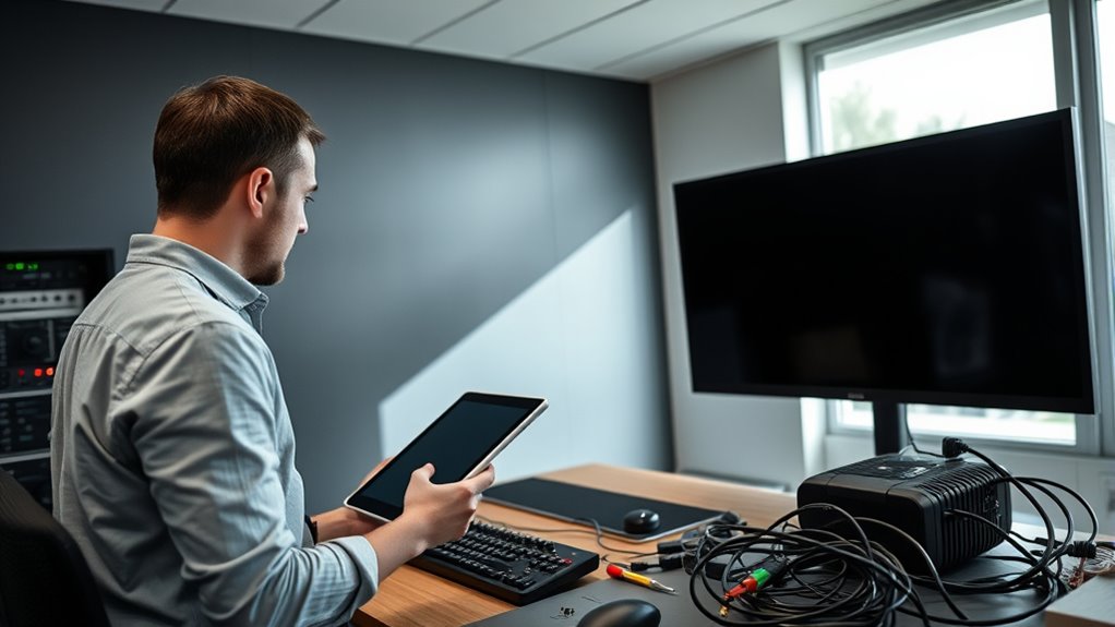 When troubleshooting AV integration issues like no signal or sound, start with remote diagnostics to check connections, power, and settings. Verify that cables are secure and compatible, updating firmware if needed. Power cycle devices to clear glitches and reset the system. Consulting manufacturer support and proper documentation can guide you through specific problems. Keeping these steps in mind will help you quickly identify the cause; discover more tips to resolve these issues effectively.