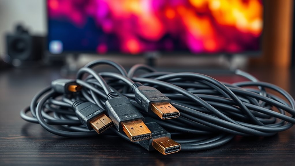Cheap cables can definitely impact your gaming and VR experiences by causing signal degradation, which leads to increased latency issues. You might notice lag, reduced image quality, or dropped signals, especially during fast-paced gameplay or high-resolution VR. To avoid these problems, invest in quality cables that support proper bandwidth and shielding. This guarantees smooth performance, maintains immersive visuals, and minimizes frustrating delays during your gaming or VR sessions.