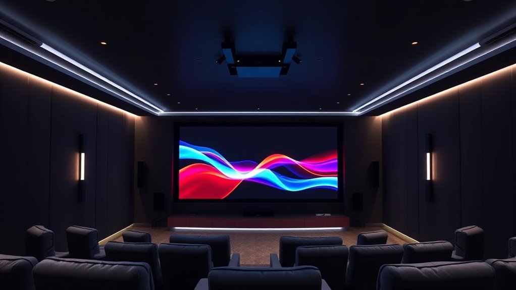 Room acoustics are vital to Atmos and DTS:X performance. If your space has poor sound absorption, echoes can distort audio clarity, while excessive reflective surfaces may muddle spatial effects. Proper speaker placement is essential; position speakers to optimize sound distribution and minimize reflections. Adjusting sound absorption materials like carpets or wall panels helps enhance immersion, ensuring you experience the full depth and precision of next-gen audio formats in your home theater.
