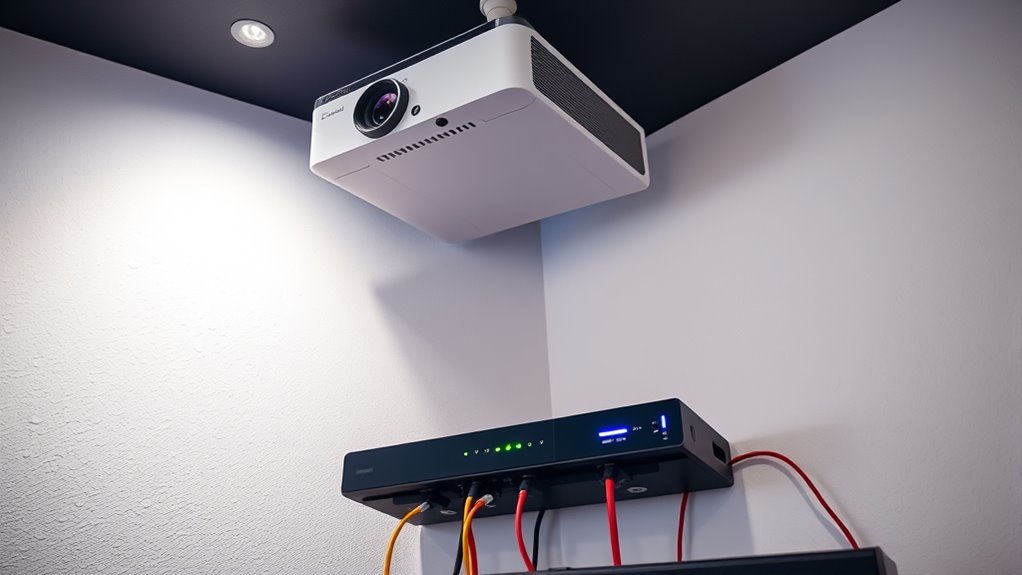 To guarantee your projector’s audio will sync properly with your gaming console, you need to verify that your devices support compatible standards. First, check the audio format compatibility between your console and projector, ensuring they both support common formats like Dolby Digital or PCM. Mismatched formats can cause delays or loss of sound. Next, confirm Bluetooth compatibility if you plan to use a wireless connection. Your console and projector should both support Bluetooth audio profiles to ensure seamless pairing. If either device lacks Bluetooth support, consider alternative wired options like HDMI or optical cables. Verifying these standards beforehand prevents connection issues and assures that your audio remains synchronized, providing a smooth gaming experience. Additionally, understanding the contrast ratio of your projector can help optimize your viewing environment for an immersive gaming experience.