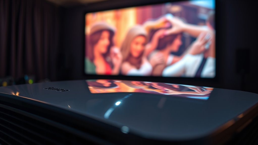 Coincidence suggests that software updates can indeed reduce audio latency in projectors. You should regularly install firmware updates and optimize drivers, as these often include performance improvements and bug fixes. By keeping your projector’s software current, you guarantee better synchronization between audio and video, minimizing lip-sync issues. Staying proactive with updates is the simplest way to enhance audio performance and enjoy seamless playback during presentations or movie nights.