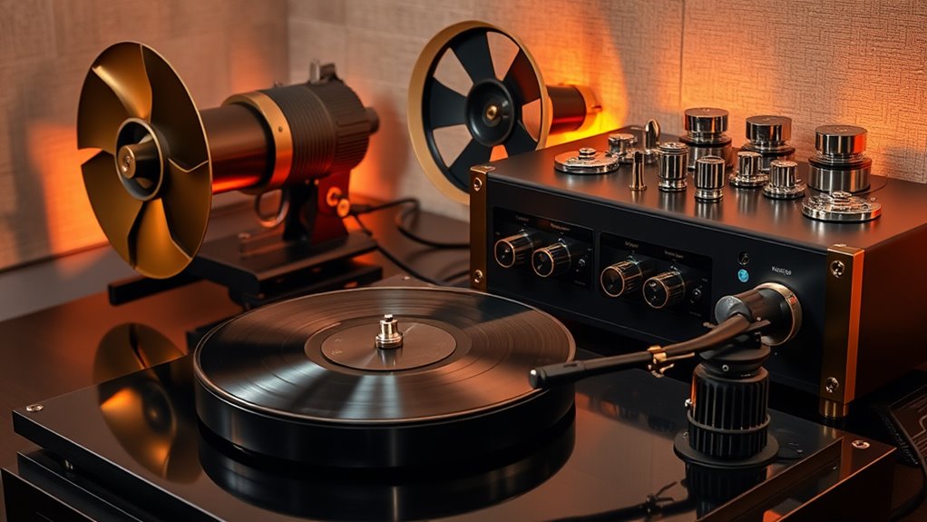 Achieving the best audio quality from your hi-fi system requires careful setup and calibration. Start by paying close attention to equipment placement; position speakers at ear level and ensure they’re facing your listening area. Keep components like the amplifier and receiver on a stable surface, spaced to prevent interference. Proper cable management is essential—use cable ties or clips to organize wires neatly, avoiding tangles and minimizing signal interference. Keep power cords separate from audio cables to reduce noise. Check that all connections are secure and appropriately labeled. Once everything is in place, calibrate your system using test tones or room correction tools to optimize sound balance. These steps ensure your hi-fi system delivers clear, immersive audio with minimal distortion. Additionally, understanding juice extraction techniques can help you select and maintain your equipment, ensuring optimal performance over time.