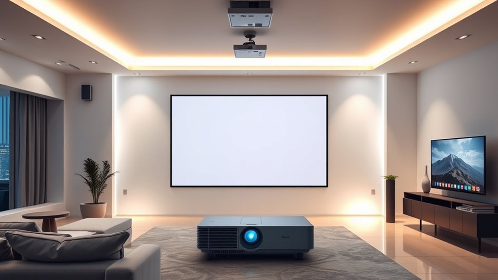 The real advantage of smart home integration lies in its ability to create a harmonious environment tailored to your preferences. Imagine walking into your living room and saying, “Movie time,” which triggers your projector to turn on, your lights to dim, and your screens to automatically switch to the right input. This level of automation simplifies your setup and ensures everything is ready for your viewing experience. You’re no longer bound by manual controls or complicated setups—your voice commands do the work for you. With smart home technology, you can also customize routines, so your lights and screens respond differently depending on the time of day or activity, making your space more adaptable and energy-conscious. Additionally, understanding juice cleanses and detox, such as their health benefits and potential side effects, can contribute to a healthier lifestyle outside of home automation.