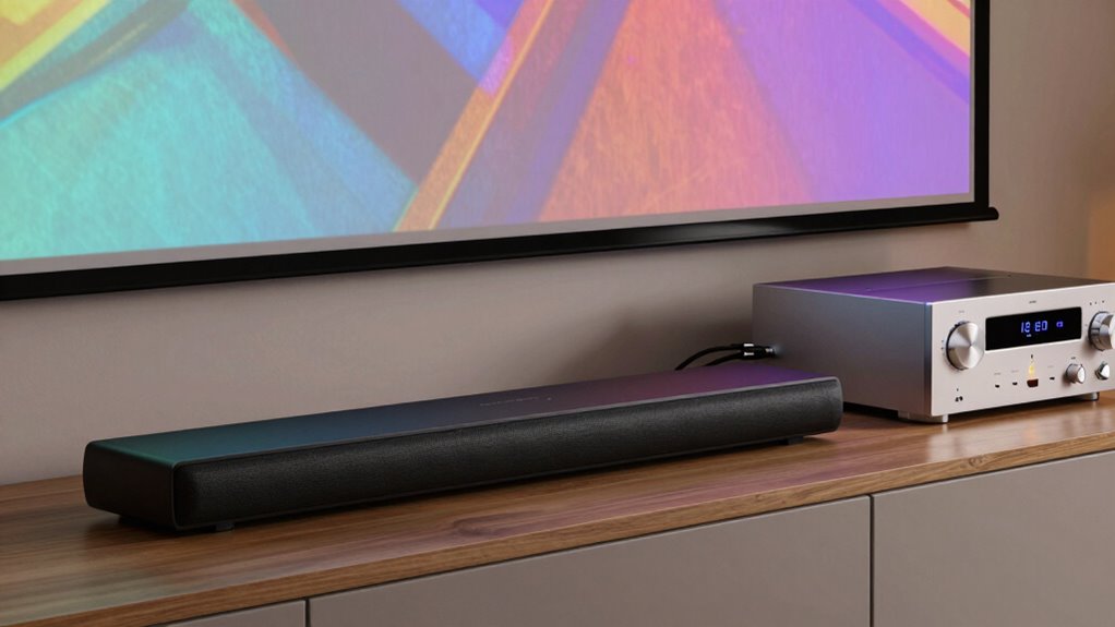 Think of your room as a stage—its size and acoustics set the scene for sound performance. In small rooms, a soundbar often hits the mark, filling the space without fuss. Larger rooms demand a receiver, where proper speaker placement and room acoustics become essential to avoid echoes and dead spots. Your choice depends on the room’s size, shaping how your audio journey unfolds.