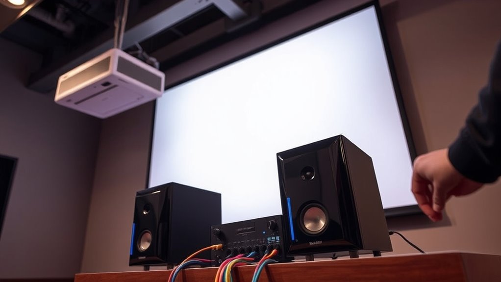 Once you’ve identified your speaker type and connection method, the next step is to connect them to your projector. If you’re using wireless speakers, confirm they’re compatible with your projector’s wireless connection options, such as Bluetooth or Wi-Fi. Power on the speakers and enable pairing mode, then select your speakers from the projector’s menu. For wired connections, connect the audio output port of your projector to the speakers using the appropriate cable—like an AUX or HDMI ARC cable. Proper speaker placement is vital; place them where sound fills the room evenly and minimizes echo or distortion. Keep wireless speakers within a good range to avoid dropouts. Once connected, test the audio to verify a stable link and ideal placement for the best sound experience. Effective connection methods can ensure optimal audio quality.