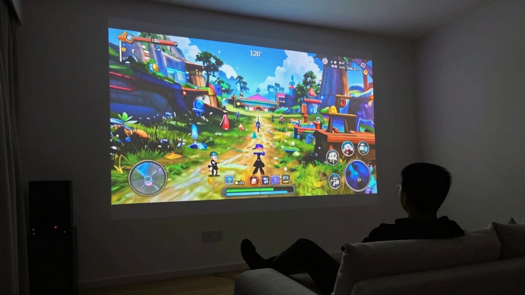 Room lighting greatly influences your ideal projector screen size. In rooms with bright ambient lighting, a larger screen can help combat screen glare and maintain vivid visuals. However, if the room is dimly lit, you can opt for a smaller screen without sacrificing immersion. Adjusting your screen size based on ambient lighting ensures you get the best gaming experience, avoiding glare and enhancing clarity for immersive gameplay.