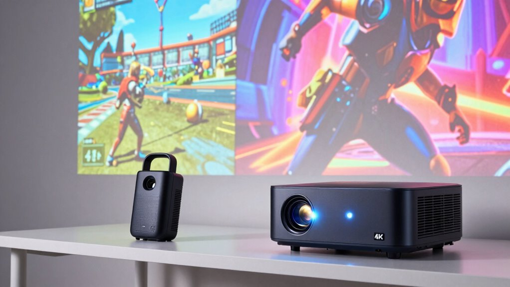 Next, consider projector resolution, which is vital for both casual and competitive gaming. The resolution determines how clear and detailed your image will be on the screen. For casual play, a 720p or 1080p resolution can work well, offering decent image quality without breaking the bank. These resolutions are sufficient for general gaming and streaming content, providing a good balance between cost and visual clarity. On the other hand, if you’re into competitive gaming, where every pixel counts, investing in a projector with a 4K resolution is wise. Higher resolution ensures that fast-moving visuals stay crisp, reducing motion blur and pixelation, which can be pivotal in high-stakes gameplay. Additionally, understanding lighting conditions and how they impact your choice can help you select the most suitable projector for your needs. Being aware of ambient light factors can guide you toward the optimal brightness settings and projector specifications. Recognizing projector placement options, such as throw distance and lens shift, can also help you optimize your setup without compromising image quality.