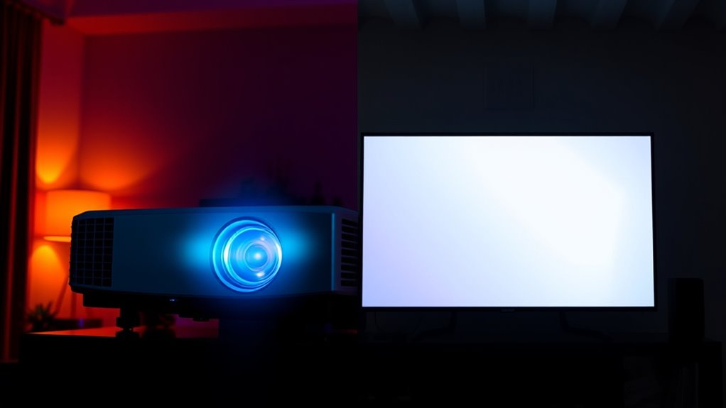 So, when choosing between DLP and LCD projectors for gaming, consider your priorities. If you’re after smooth visuals and minimal motion blur, DLP might be your best bet—imagine gaming on a DLP projector with vibrant, flicker-free images during intense battles. But if you prefer bright, vivid colors and longer-lasting displays, an LCD could serve you better. Ultimately, pick the tech that matches your gaming style, and you’ll enjoy immersive experiences every time.