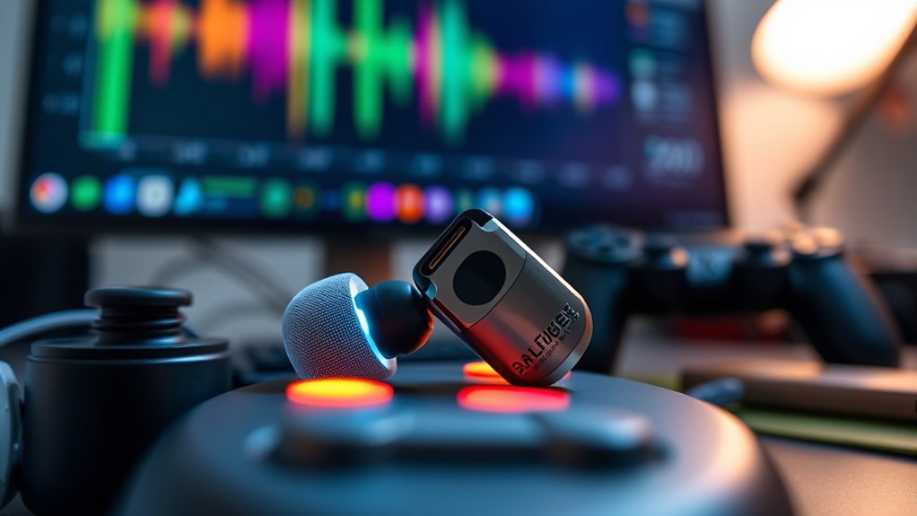 In gaming, audio latency—the delay between an in-game event and when you hear it—can considerably impact your experience and performance. When audio isn’t synchronized properly, it disrupts your immersion and can cause you to react too late or incorrectly. Precise audio synchronization ensures you hear sounds exactly when they occur, giving you a competitive edge. High audio latency can also degrade sound quality, making audio cues feel disconnected or muffled, which diminishes your ability to interpret in-game actions accurately. Whether you’re tracking footsteps or gunfire, low latency helps maintain the integrity of sound cues, allowing for quicker reactions and better gameplay. Additionally, understanding audio latency metrics can help you select the right equipment for optimal performance. Ultimately, minimizing audio latency enhances both sound quality and your overall gaming experience, making every sound count.