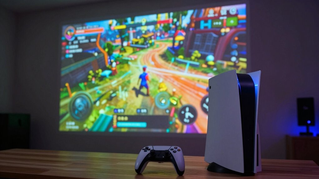 Moreover, paying attention to viewing distance is essential for achieving optimal clarity and immersion. When you properly calibrate your projector for room lighting, you can significantly enhance image quality and reduce eye strain during extended gaming sessions. Ensuring your setup accounts for ambient light conditions can also make a noticeable difference in overall picture quality, especially in rooms with unpredictable lighting. Ultimately, when gaming on a projector, prioritize your projection setup and screen size over resolution alone. Consider how big you want your gaming display to be and whether your projector can handle that size with clarity and brightness. Remember, a larger, well-calibrated screen with proper setup creates a more immersive and enjoyable gaming environment than simply chasing higher resolution numbers. Making these thoughtful adjustments will turn your living room into a true gaming theater that’s perfect for long hours of play.