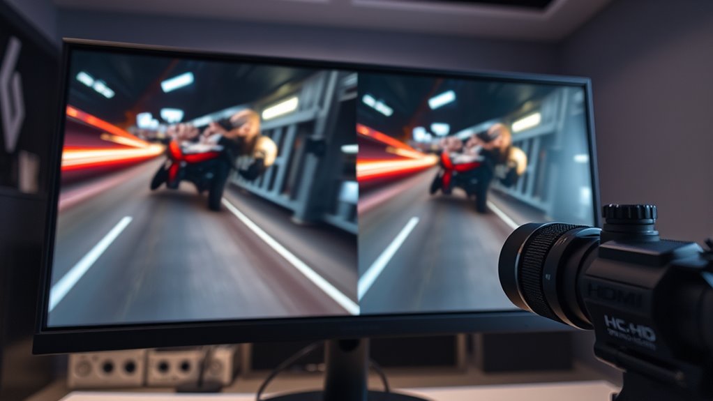 Motion processing features, such as frame interpolation, motion smoothing, and ultra-smooth technology, can substantially affect HDMI latency by adding extra steps to how images are rendered. These features enhance picture smoothness but often introduce noticeable delay. When you enable motion smoothing, your display creates intermediate frames, which increases processing time and latency. This extra processing can cause a delay between your source signal and what you see on screen, impacting fast-paced gaming or real-time applications. To help you understand, here’s a comparison: