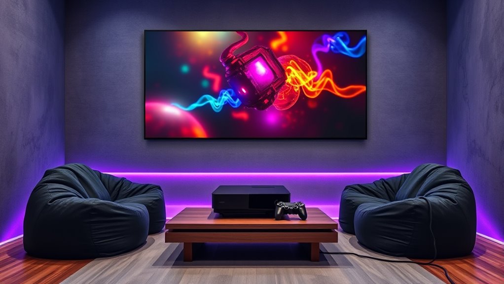 For an ideal projector gaming setup with next-gen consoles, focus on balancing lighting and calibration. Use dimmable or indirect lights to prevent glare while enhancing image vibrancy. Fine-tune your projector’s focus, keystone, and color settings for sharp, vivid visuals. Combining these adjustments creates an immersive environment that boosts gameplay clarity and comfort. If you keep exploring, you’ll discover detailed tips to perfect your setup and elevate your gaming experience even further.