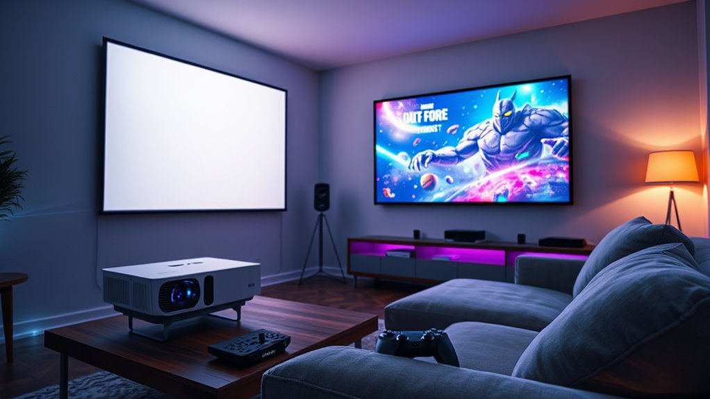 Next, consider ambient lighting. The environment where you’re gaming plays a *vital* role in image quality and overall experience. Too much ambient light can wash out your picture, reducing contrast and making dark scenes hard to see. Conversely, a completely dark room can cause eye fatigue and make it harder to focus. The goal is to strike a balance—dim the lights or use blackout curtains to limit excess glare while avoiding complete darkness. If your projector has a high lumen output, it can handle more ambient light, but for *maximum* results, keep the room moderately lit. Use indirect lighting, such as bias lights behind your screen or soft lamps, to reduce eye strain and improve perceived contrast. This environment adjustment complements your screen calibration, ensuring colors stay true and contrast remains sharp.