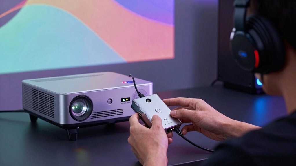 Jumping the gun, upgrading your projector’s firmware can often improve audio synchronization by fixing bugs and optimizing performance. Firmware updates are like a tune-up for your device, helping reduce audio lag during gaming. While they might not eliminate all delay, they can make a noticeable difference. Always guarantee your projector’s firmware is current, as manufacturers regularly release updates to enhance audio and visual performance, keeping your gaming experience smooth as silk.