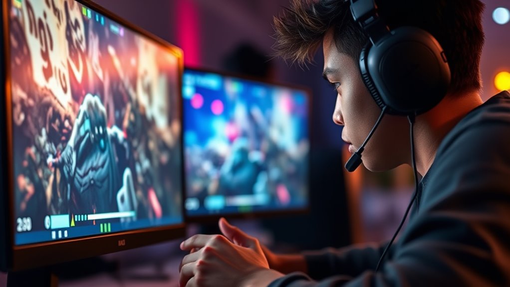 To avoid screen tearing while gaming, make certain your graphics drivers are up-to-date and set your monitor’s resolution and refresh rate correctly. Enable V-Sync or use adaptive sync technologies like G-Sync or FreeSync, which synchronize your GPU’s frame rate with your monitor’s refresh rate for smoother visuals. Adjust game settings to cap frame rates if needed and invest in a high-quality monitor with a high refresh rate. If you want more tips to get the best experience, keep exploring the solutions available.