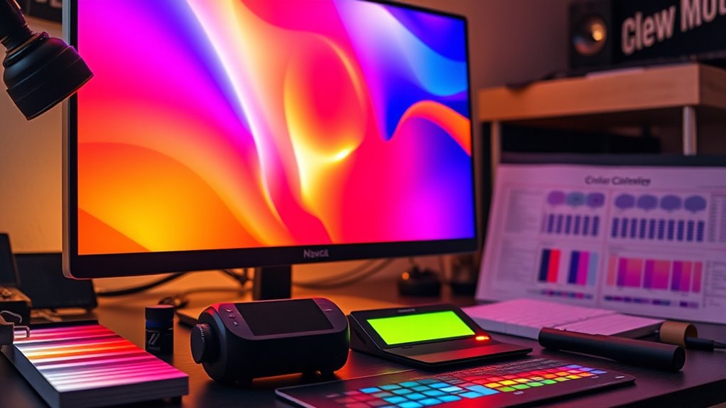 Imagine you’re in a vintage film studio, and calibration tools help you attain perfect color accuracy. The process usually takes about 30 minutes to an hour, depending on your experience and equipment. You’ll use calibration tools like a colorimeter or spectrophotometer, which guide you through fine-tuning your display. Patience is key; this guarantees your colors are true and consistent, creating that cinematic look you desire.
