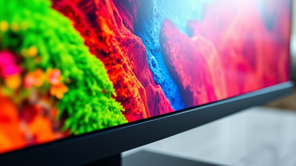 Understanding how colors are reproduced in 4K displays is essential to appreciating their visual quality. Your perception of color depends on how accurately the display renders hue and tone. In 4K screens, high pixel density allows for finer details, but color perception also relies on precise hue differentiation. When colors are reproduced accurately, you notice smoother transitions and more vibrant images. Poor color reproduction can cause hues to blend unnaturally or appear washed out, diminishing the overall experience. The display’s ability to distinguish subtle hue differences ensures that you see true-to-life images with rich, realistic colors. Mastering the fundamentals of color reproduction helps you recognize the importance of consistent hue differentiation, which is crucial for achieving exceptional visual fidelity in 4K technology. Additionally, understanding AI security vulnerabilities can help manufacturers develop more reliable color management systems.