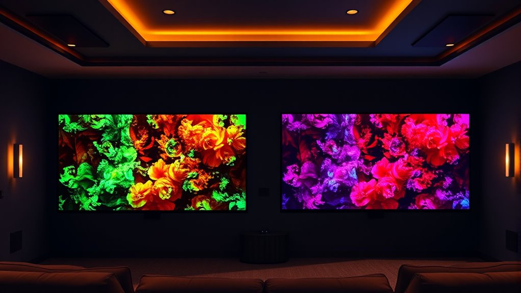 In home cinema, DCI-P3 offers a wider color gamut than Rec.709, making visuals more vibrant, immersive, and lifelike. While Rec.709 is the standard for HD content and guarantees consistent color accuracy across devices, DCI-P3 supports richer reds, greens, and yellows, ideal for high-end displays and digital cinema. Understanding these differences can help you optimize your setup for the best picture quality—continue exploring to learn how calibration and content choices matter.