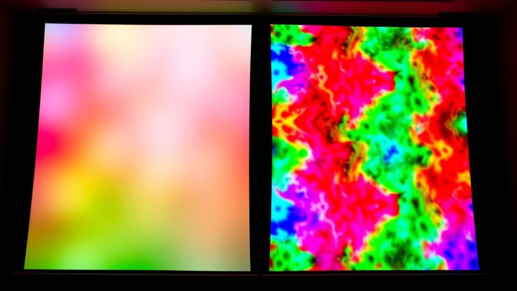 DCI-P3, on the other hand, is a newer standard developed for digital cinema projection and high-end consumer devices. It encompasses a much wider color gamut, allowing projectors and displays to reproduce more saturated and vivid colors. If you’re aiming for a cinematic look or working with high-quality digital content, understanding DCI-P3 is vital. It provides a richer, more immersive viewing experience by capturing a broader spectrum of colors. This means that projectors supporting DCI-P3 can display more lifelike and vibrant scenes, but it also requires you to consider display calibration and color management to guarantee color accuracy. When comparing Rec.709 and DCI-P3, the latter’s larger color space offers more flexibility in achieving visually stunning images, especially in dark or highly colorful scenes.