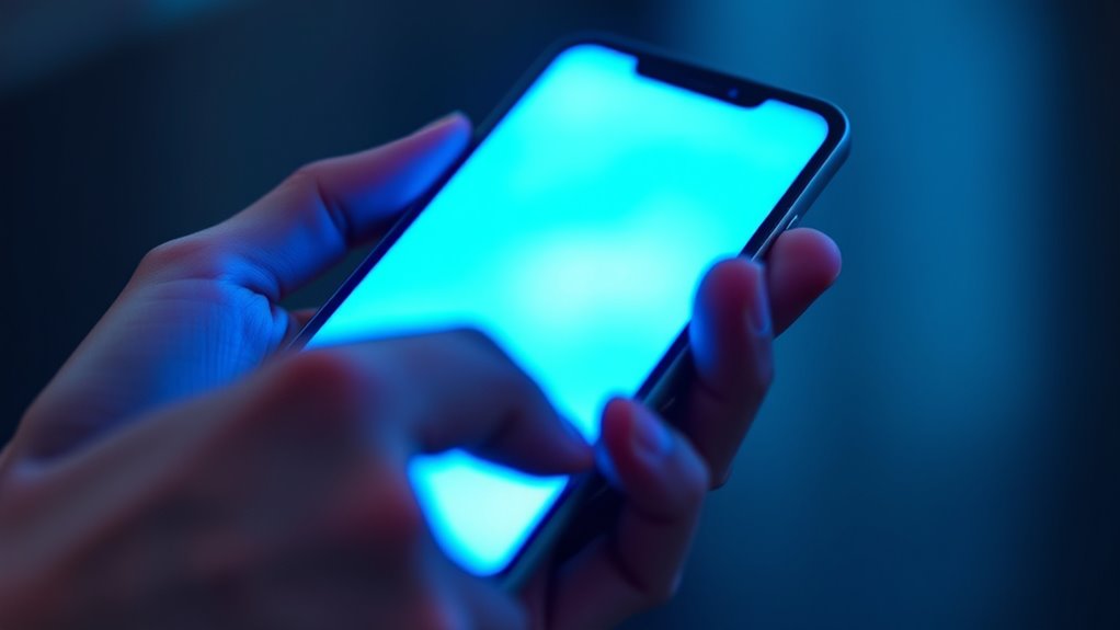 Have you ever wondered why colors look different on various screens? The answer lies in the complex interplay of how screens emit light and how your eyes perceive it. When you look at a device, the colors you see are primarily created through blue light emission. Different screens use tiny pixels that emit specific amounts of red, green, and blue light to produce a full spectrum of colors. However, not all screens are calibrated equally, which is why a vibrant red on one device might appear dull or oversaturated on another. To combat this, color calibration techniques are used to adjust screens so that colors are consistent across devices. These calibration processes involve tweaking brightness, contrast, and color balance to match a standard, guaranteeing that what you see aligns with the intended appearance. Without proper calibration, colors can shift, leading to misinterpretations of images, videos, or even text. Additionally, understanding the role of blue light emission in perceived color helps users optimize their viewing experience and reduce eye strain. Blue light emission plays an essential role in how vivid and bright a screen appears. Blue light, with its short wavelength, contributes considerably to the perceived brightness and contrast. However, excessive blue light can distort color accuracy and cause eye strain, especially during prolonged use. Manufacturers often implement different levels of blue light emission, and some screens have blue light filters or night modes to reduce strain and improve color fidelity in low-light conditions. These adjustments impact the overall perceived color, making it appear warmer or cooler depending on the settings. Understanding how blue light emission influences what you see helps you choose the right device and adjust your settings for peak viewing. Color calibration techniques are indispensable because they ensure that the colors displayed are as true to reality as possible. Professionals, such as photographers and graphic designers, rely heavily on precise calibration to maintain color consistency across multiple screens and print media. Regular calibration involves using specialized tools like colorimeters or spectrophotometers that measure the output of your screen and adjust its settings accordingly. For everyday use, many devices come with built-in calibration options or automatic adjustments based on ambient lighting conditions. By understanding and applying these techniques, you can guarantee that the colors you see are not just a product of your device’s settings but an accurate representation of the original image or content. Ultimately, awareness of blue light emission and proper calibration helps you enjoy a more accurate and comfortable visual experience across all your screens.