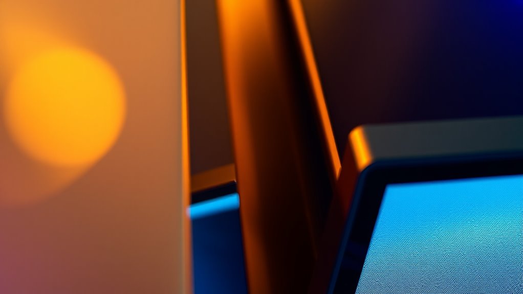 Ambient lighting conditions considerably impact brightness measurements because they influence how you perceive screen glow and contrast. Bright ambient light can make a display seem dimmer, reducing perceived brightness, while low light enhances contrast and visibility. To guarantee measurement accuracy, it’s essential to test screens in consistent lighting conditions. This way, you get a true comparison of brightness specs, helping you pick the right display for your environment.