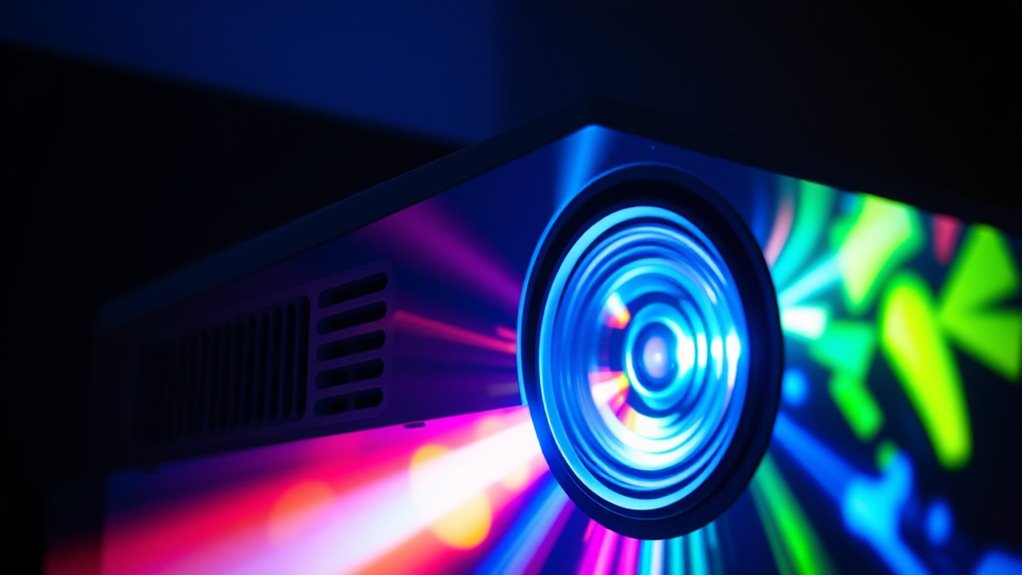 You’ll find that projector lumen ratings are generally lower than TV brightness levels, but projection contrast and color accuracy play vital roles in picture quality. A projector with high lumen output can still deliver vivid images if it maintains strong contrast and accurate colors, especially in darker rooms. TVs often excel in brightness and color consistency, but a well-calibrated projector can rival them when you prioritize contrast and true color reproduction.