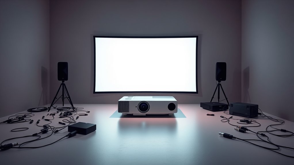 Many common projector myths, like thinking higher lumens always mean better images or larger screens automatically improve viewing, are misconceptions. Brightness isn’t the only factor that determines picture quality; your environment and other features like contrast and resolution matter too. Larger screens require compatible projectors to avoid pixelation. If you keep these myths in mind, you’ll make smarter choices. There’s more to uncover about setting up your ideal projector for peak performance.