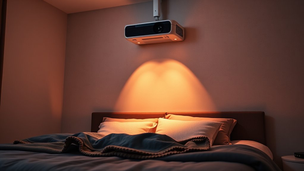 To create a cozy bedroom projector setup, mount your projector on the ceiling to keep your space clutter-free and guarantee a stable view. Use blackout curtains to control ambient light for clearer images and position your furniture facing the screen comfortably. Incorporate a quality sound system for immersive audio. Organize cables neatly with conduits or cable management kits. If you want to make your space even more relaxing, keep exploring easy tips to enhance your home theater experience.