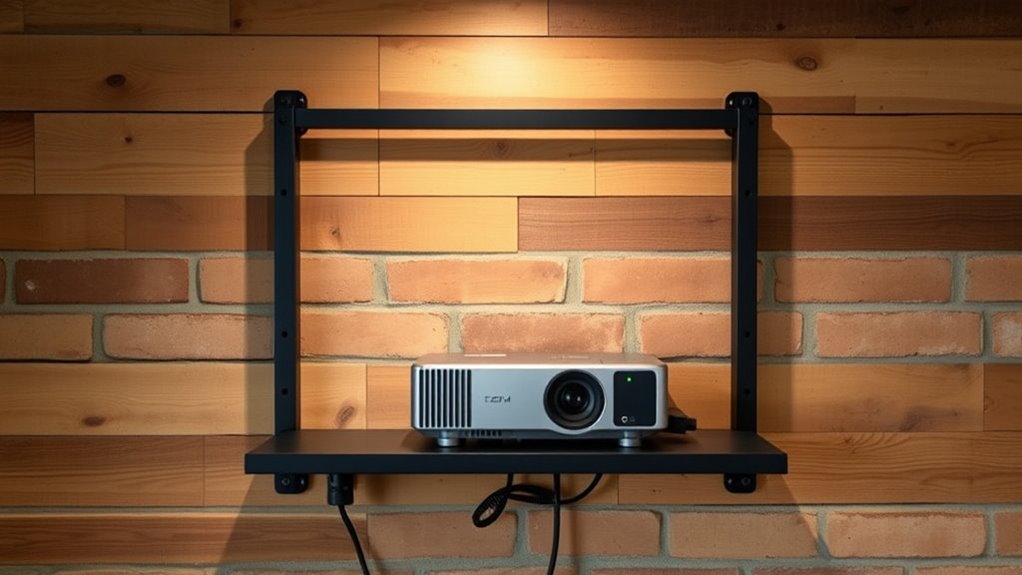 To guarantee your projector stays secure and functions properly, you need to use the right mounting hardware. Finding the ideal projector position helps prevent shadows and ensures a clear image. Carefully securing both the mount and the projector will give you a safe, clutter-free setup. Incorporating vertical storage solutions for your projector accessories can also help maintain an organized and efficient space.