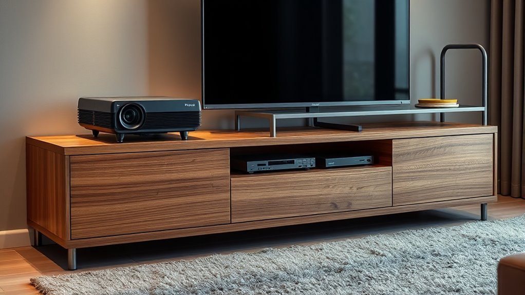 To choose the right furniture for your projectors, consider sturdy TV stands or shelves that can support both traditional and ultra short throw units securely. Look for features like adjustable shelving, cable management options, and mounting possibilities to keep cords organized and guarantee stability. For UST projectors, low-profile stands or custom mounts work best near the wall. Selecting furniture that complements your space and offers easy access will enhance performance and aesthetics—if you continue exploring, you’ll discover even more tips.