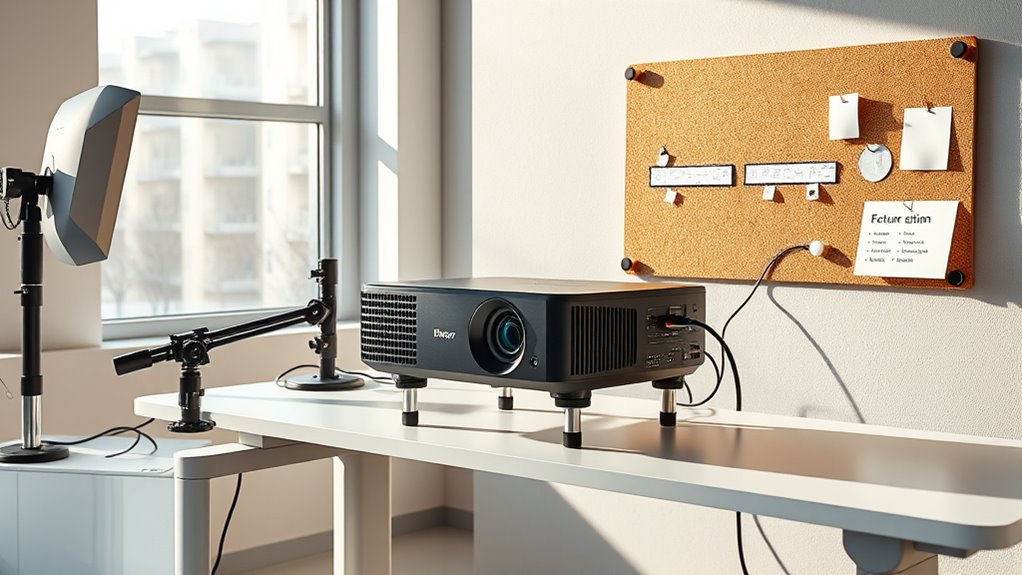 To plan for an evolving projector setup, focus on scalable, modular components that can grow with your needs. Choose upgradeable hardware, flexible mounting options, and networked projectors for easy expansion. Document your infrastructure and identify future requirements early on to avoid costly reconfigurations. Prioritize setup flexibility, ensuring wiring and power systems support added units without disruption. If you want to guarantee your system remains adaptable over time, explore strategies that keep your setup ready for growth.