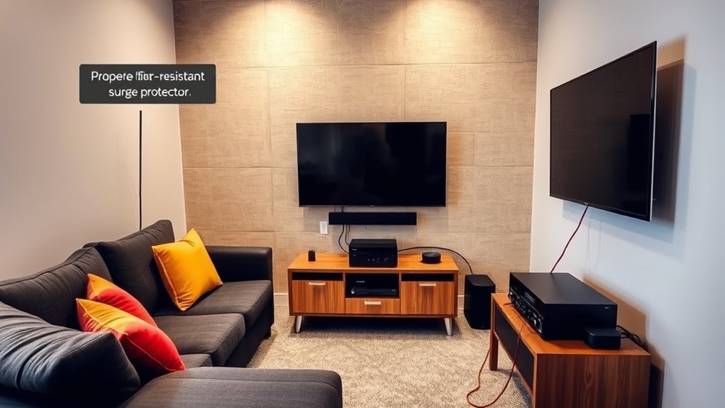 Another critical safety aspect is fire extinguisher placement. You should have at least one fire extinguisher rated for electrical fires (Class C) within easy reach of your home theater area. Place it near the entrance or in a location that’s accessible without obstruction. Don’t hide it behind furniture or in hard-to-reach spots, as quick access can make all the difference during an emergency. Keep the extinguisher’s pressure gauge in the green zone and check it regularly to ensure it’s fully charged. Familiarize yourself with how to operate it so you can act swiftly if needed. Remember, a fire extinguisher is a crucial safety tool, and having it close by ensures you’re prepared for any electrical sparks or small fires that could occur.
