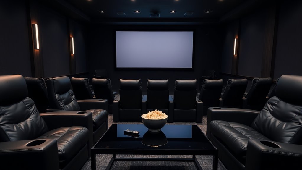 You might worry about sound interference ruining your viewing experience, but soundproofing techniques and smart seat arrangement tips can help. Position seats with adequate space and stagger them to minimize sound overlap. Use acoustic panels or curtains to absorb noise, and consider placing sound-absorbing materials behind seats for added clarity. These approaches make certain each seat enjoys clear sound without interference, elevating your home theater experience to professional standards.