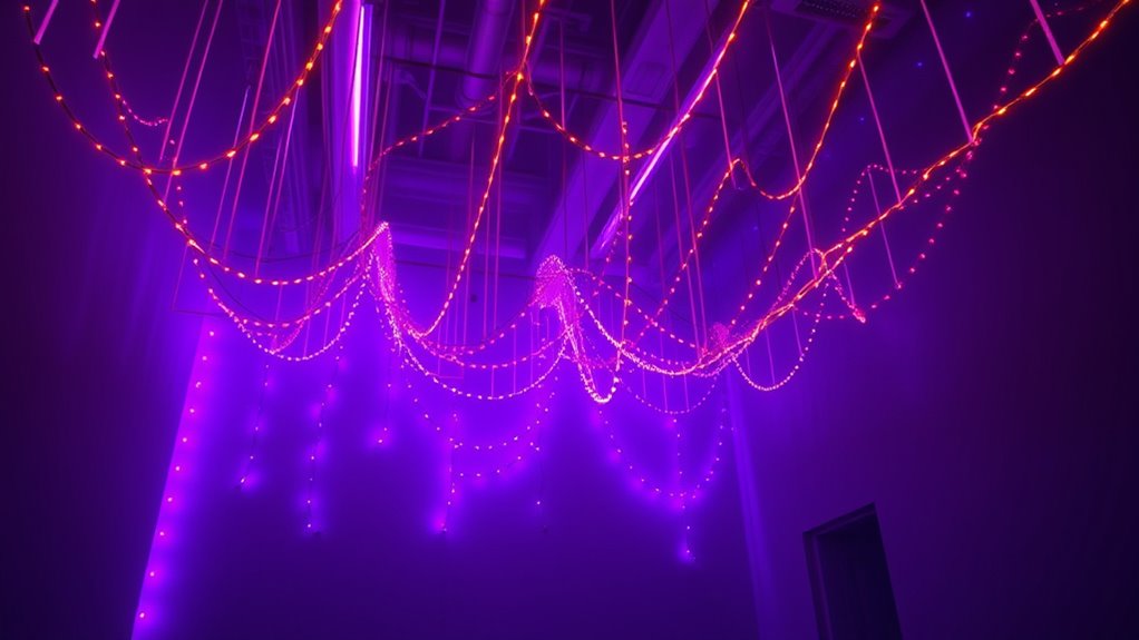 You should always prioritize fire safety by avoiding overloading circuits and ensuring your lighting is properly installed. Use lights with safety certifications and avoid placing them near flammable materials. Make sure to check electrical grounding to prevent shocks or shorts. Regularly inspect cords and connections for damage, and turn off lights when not in use. These precautions help keep your space safe while enjoying your immersive ambient lighting.