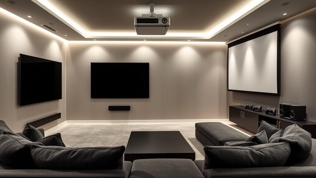 Creating a multi-purpose media room means balancing TV and projector setups, blending convenience with immersion, comfort with style. It’s about designing a space that adapts to your needs, enhances your entertainment, and reflects your taste. By thoughtfully integrating both options, you guarantee versatility, maximize functionality, and elevate your viewing experience. Ultimately, a well-balanced media room is where technology and design come together seamlessly, offering you a space to relax, entertain, and enjoy to the fullest.