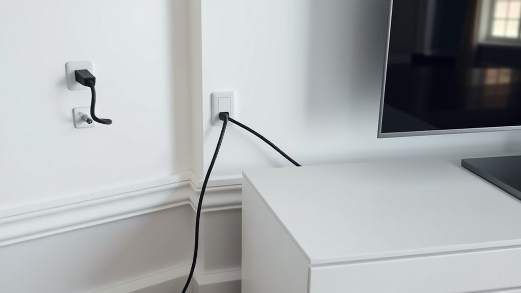To hide cables for a clean look, focus on cable concealment and effective cable management. Use wall panels, conduit, or raceways to hide and route cables neatly along walls or ceilings. Velcro straps or cable clips help keep cords organized behind furniture. Consider running cables through baseboards or behind furniture to minimize visible clutter. With proper cable management, your room stays tidy, safe, and visually appealing, creating a seamless entertainment setup.