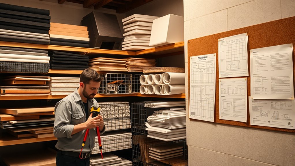Ensuring your soundproofing efforts meet legal and safety standards requires thorough compliance checks and proper documentation. You’ll need to follow building permit procedures carefully, submitting detailed plans that demonstrate adherence to local soundproofing codes. During construction, inspection protocols must be observed, allowing officials to verify that materials, methods, and installation meet established standards. Keep detailed records of all communications, permits, inspection reports, and test results, as these serve as proof of compliance. Regular inspections ensure ongoing adherence and help identify potential issues early. Proper documentation not only streamlines the approval process but also provides legal protection if disputes arise. Staying organized and proactive in managing these requirements ensures your project remains compliant and avoids costly delays. Additionally, understanding soundproofing standards can help you anticipate and address compliance challenges before they cause delays.