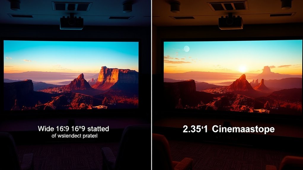 When choosing between 16:9 and 2.35:1 (Cinemascope) for your projector screen, consider your content and space. 16:9 is versatile, perfect for streaming, gaming, and everyday use, offering balanced and sharp images. 2.35:1 provides a wider, more cinematic experience, ideal for movie nights and immersive viewing. Ensuring your screen matches your preferred aspect ratio prevents distortion and enhances picture quality. Keep exploring to discover which option best suits your setup and viewing habits.