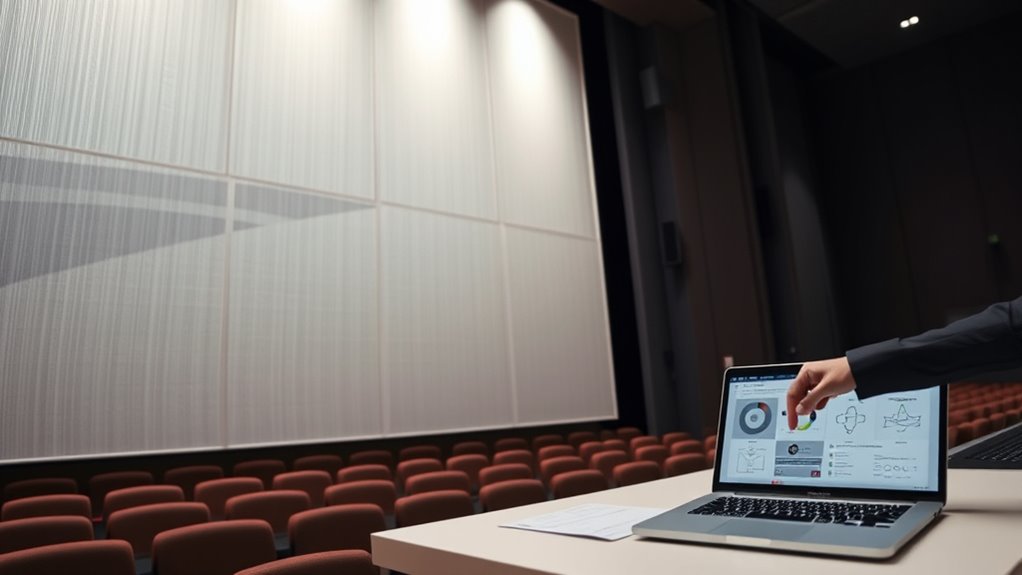Although acoustically transparent screens appear like regular screens, they’re specially designed to let sound pass through without distortion. This is achieved through the screen fabric, which is crafted with acoustic transparency in mind. The fabric is woven or perforated to ensure it doesn’t block or muffle sound waves, allowing audio to travel freely behind the screen. Unlike traditional screens that can absorb or reflect sound, acoustically transparent screens maintain audio clarity while displaying visuals. The key is the unique material and structure of the screen fabric, which balances visual quality with sound permeability. By understanding this, you can better appreciate how these screens work seamlessly to deliver both clear sound and sharp images without compromise. Additionally, the design of these screens is often inspired by Audi Tuning techniques that optimize performance and efficiency.