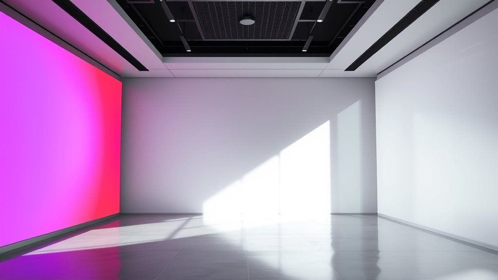 When it comes to bright rooms, ALR (Ambient Light Rejection) screens often outperform white screens. In such environments, ambient light can wash out images on standard white screens, reducing screen contrast and making details harder to see. ALR screens are specifically designed to reject ambient light, directing more of the projected image toward you while minimizing reflections from surrounding light sources. This results in improved screen contrast, even in well-lit spaces. You’ll notice brighter colors and sharper details, making your viewing experience more vivid and immersive. While white screens can struggle under high ambient light, ALR screens adapt better, providing a clearer, more vibrant picture. That’s why they’re typically the go-to choice for bright rooms. Additionally, screen technology plays a crucial role in determining how effectively a display manages ambient light, further enhancing your viewing experience.