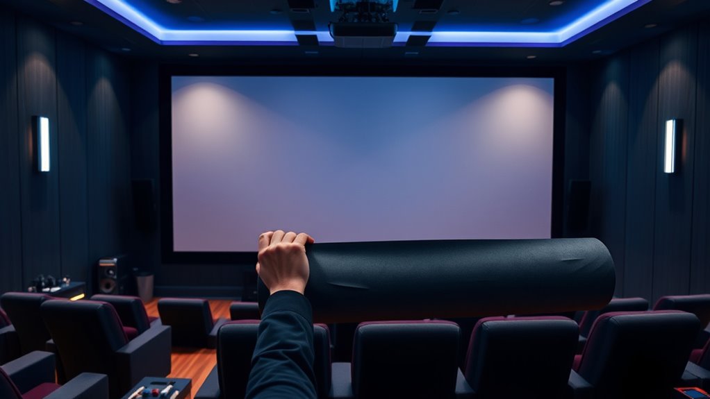 Great screen fabric choices depend on viewing angles and reflectivity—discover which option best suits your space and why it matters.