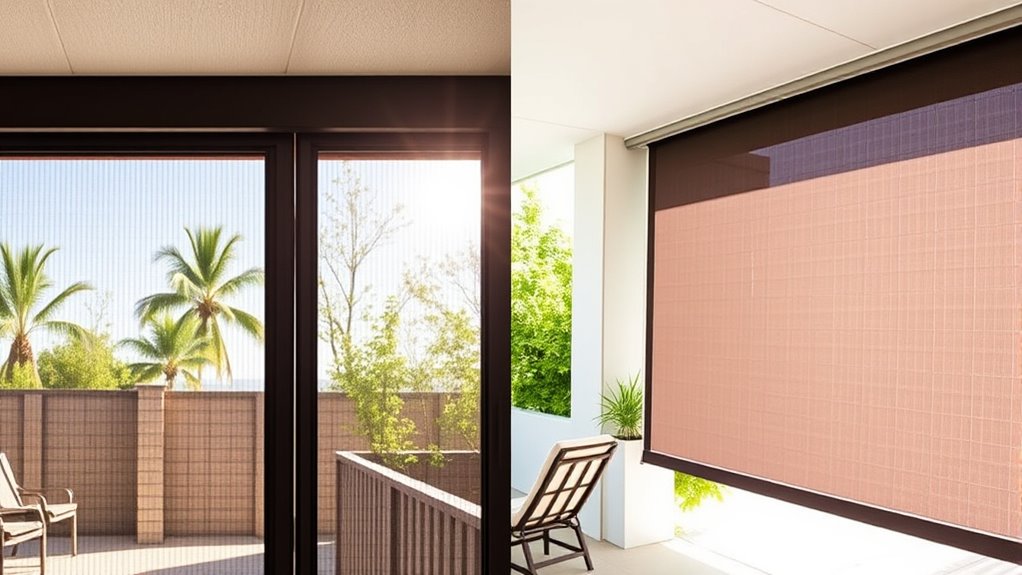 Retractable screens are more energy-efficient because they let you control airflow and sunlight, enhancing insulation benefits. When you keep them closed during hot or cold weather, they help maintain your home’s temperature, reducing energy savings on air conditioning or heating. Fixed screens, on the other hand, don’t offer adjustable insulation, so retractable options give you better control over your home’s energy efficiency and comfort.