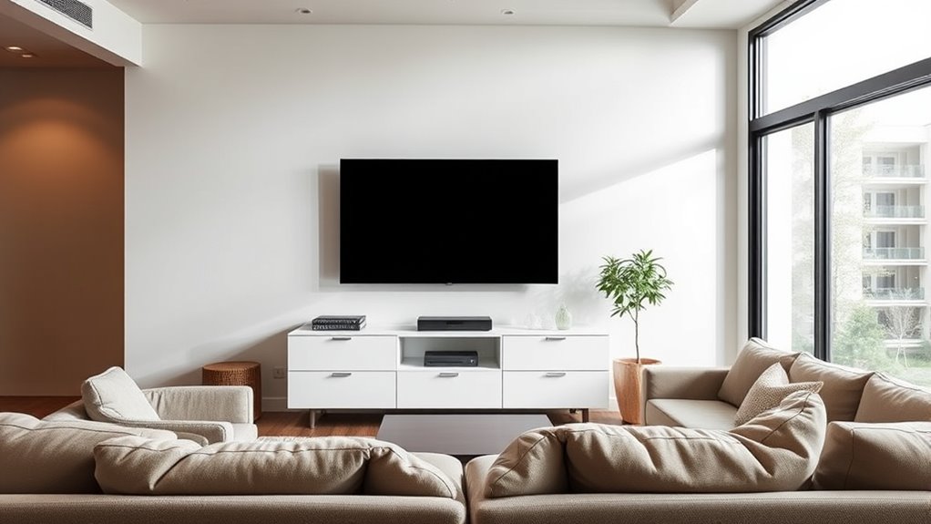 Setting up your screen correctly can greatly enhance your viewing experience, so start by positioning it at eye level to reduce neck strain and ensure comfortable viewing. Consider your wall color when choosing the placement; a neutral or matte finish helps prevent glare and reflections. Make sure the screen is centered and easy to see from your main seating area. Additionally, a good sound system is essential for immersive sound, so position speakers or soundbars to optimize audio clarity. Keep cables organized and out of sight to maintain a clean look. Adjust the screen’s angle if needed, ensuring it’s perpendicular to your line of sight. With these practical tips, your setup will be both functional and comfortable, creating the ideal environment for enjoying your favorite content.