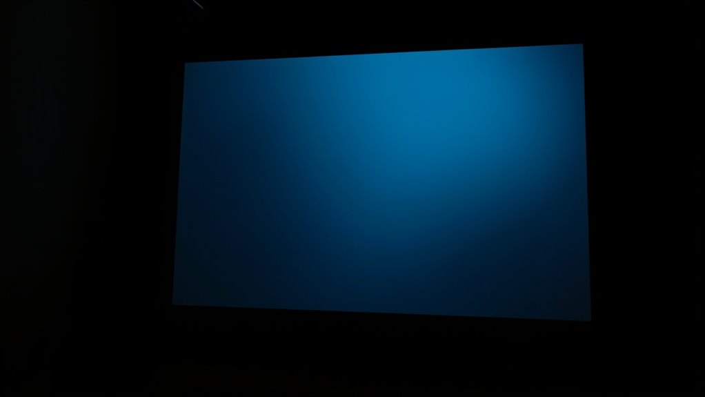 Screen gain markedly impacts your viewing angle and light reflection. Higher gain screens reflect more light directly back to you, which can cause hot spots and reduce image quality at wider angles. As your viewing angle increases, the image may appear dimmer and less vivid on high-gain screens. To guarantee consistent quality, choose a screen with a gain that balances brightness and viewing angle, avoiding excessive reflection or loss of clarity.