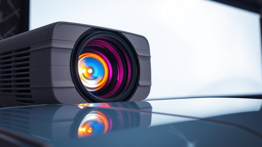 Ambient light can considerably reduce your projector image quality by washing out colors and lowering contrast. It causes screen glare, making it harder to see details clearly. To improve your viewing experience, you should control ambient light with curtains or blinds and consider a projector with higher brightness (lumens). Using a matte screen surface also helps minimize glare, ensuring your image remains sharp and vibrant even in well-lit rooms.