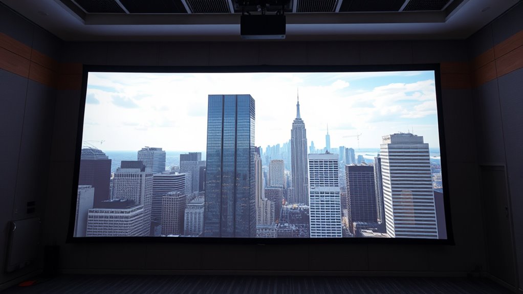 Yes, your screen material impacts keystone correction effectiveness. Different screen types, like matte or glass, reflect light differently, affecting image clarity after correction. A high-quality screen minimizes distortion and preserves image sharpness, making keystone adjustments smoother and more effective. Conversely, lower-quality or textured screens may reduce correction impact, causing more image degradation. So, choosing the right screen material is essential for maximum correction results and maintaining image quality.