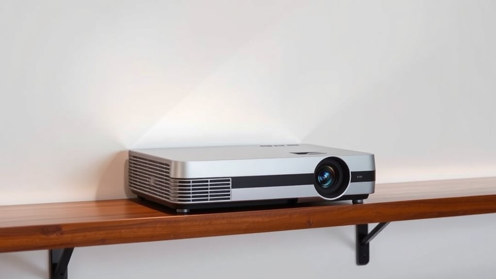 Not all projector models support lens shift, but many modern projectors do, offering greater installation flexibility. If you want versatile mounting options, check if your projector includes adjustable lens shift features. This capability allows you to offset the image without physically moving the projector, making off-center placement easier and more convenient. Always verify your specific model’s lens shift compatibility to guarantee it meets your installation needs.
