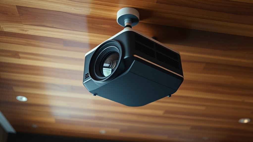 Have you considered how ceiling height impacts your projector’s mounting position? Overlooking ceiling height can lead to poor ceiling aesthetics and a cluttered appearance. If your ceiling is too high or uneven, securing a decorative mounting might be challenging, making the setup look unbalanced. A mismatch between the projector’s height and the room’s design can distract from the overall decor. Additionally, improper mounting height may cause the projector to cast a distorted or unaligned image, reducing visual quality. To avoid this mistake, measure your ceiling carefully and choose a mounting solution that complements your room’s design. Guarantee the projector is installed at a height that maintains both functional image projection and a clean, cohesive ceiling aesthetic.