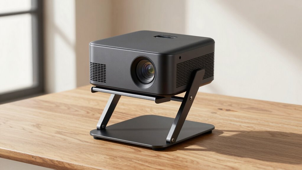 Think of a portable projector stand as the sturdy tripod beneath a lighthouse beam—without it, your projection could drift off course. I once set up my projector on a flimsy surface, only to have it wobble during an important presentation. Investing in a reliable stand keeps your setup steady and your audience focused. Remember, a good stand isn’t just support; it’s the foundation that makes your visuals shine bright and clear.
